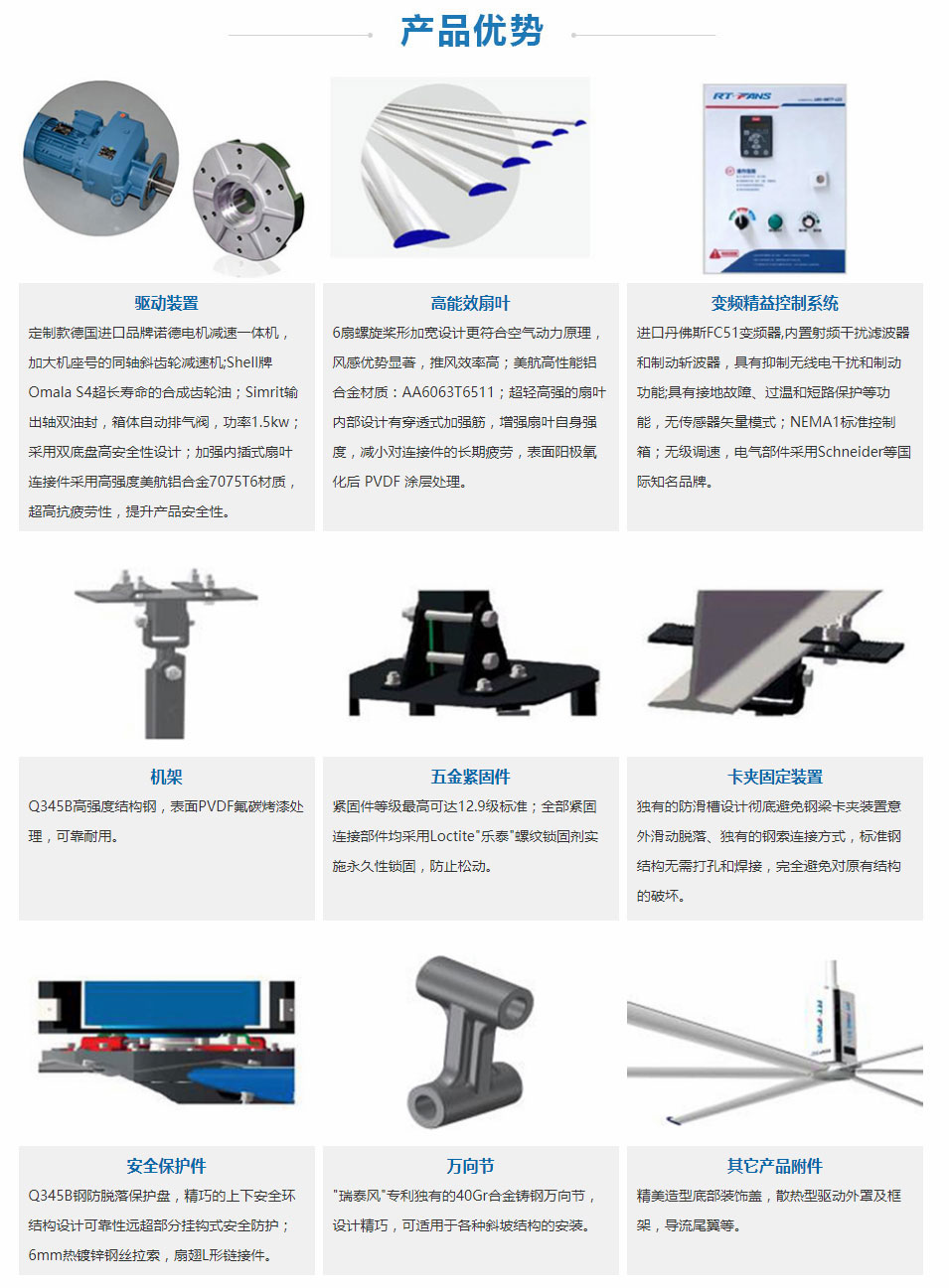 5、安裝安全便利,美觀亮麗:風扇安裝在離地面4米以上的上部空間,通過卡夾方式固定在屋面結構梁上,不會影響任何地面工作區域正常工作進程,美觀、大氣、安全可靠。若風扇選配絢麗的瑞泰風彩色扇葉,自然形成一道亮麗的風景線。