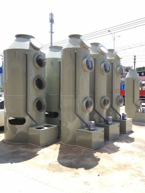 本工藝采用兩臺自主設計的改型的噴淋塔串聯使用。風機安置于兩塔之間,以防止其被油性氣體污染腐蝕,同時保證抽風效果。噴淋塔,在極性吸收液的作用下吸收極性有機分子,進行除油、除煙塵凈化處理;處理后的廢氣經過風機進入2#噴淋塔,在非極性吸收液的作用下吸收非極性有機分子,進行除異味凈化處理,達標排放。噴淋塔是藥劑噴淋處理工藝中的關鍵設備。針對PVC塑料生產廢氣,設計采用PP材質的噴淋塔。噴淋塔內部由隔層隔開。