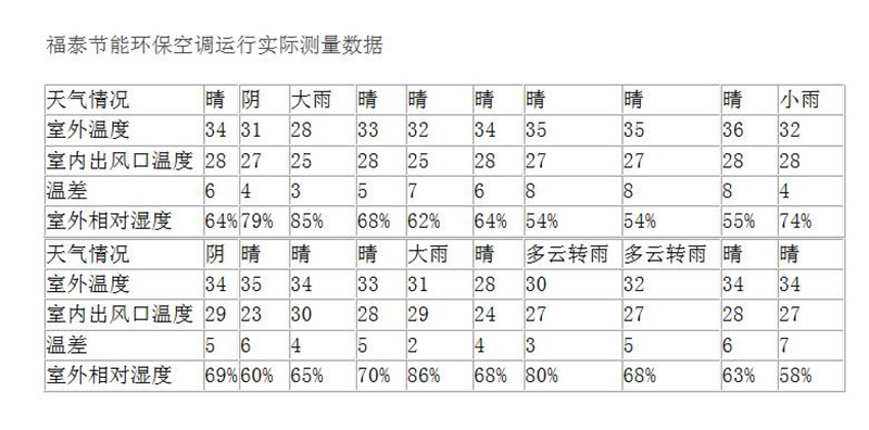 水環保空調安裝降溫后效果測試 最近電話咨詢比較多的客戶提到一個這樣的問題關于環保空調安裝后效果是怎么樣的!對于這樣的問題首先我們要看你想達到什么效果,舉例我們的一個1000平方的車間如果你想使整個1000平方車間溫度全都降下來的話,那采取的就是環保空調整體降溫方案了!環保空調的安裝臺數是根據室內的換氣次數來決定了。每小時的換氣次數越多,那它的降溫效果就會越好,但同時也意味著安裝成本的加大。1000平方的車間安裝12臺降溫效果還是可以做到整體降溫的,如果現在我們就來分析,一個200平米的塑膠廠,安裝二臺1.8W風量的環保空調,每時的換氣量大概是45次/小時。假設改塑膠廠是出于正常工作的狀態,室外氣溫約為37℃,經過環保空調降溫后的冷風大概為27~29℃左右。由于塑膠廠的發熱機器比較多,所以安裝兩臺環保空調是塑膠廠內的平均氣溫大概是32-34攝氏度的樣子,顯然這并不是理想的效果。這種情況下,安裝四臺環保空調的話,能是換氣量達到90次/小時(這是在室內外空氣流通順暢的情況下,如若需要可安裝負壓風機促進空氣流通)。那同樣的工作環境下,能使室內溫度降到30度以下,達到預期想要的效果。環保空調的安裝臺數是根據車間的發熱設備及車間的面積來定的,據我們多年的安裝經驗,一般的塑膠廠上了2000平米以上的車間,車間塑膠機比較多的情況下,基本上都選擇是的崗位送風,根據工作崗位來決定安裝環保空調臺數!以下是福泰水空調廠家根據安裝的客戶進行跟蹤測試降溫效果做出了幾天的跟蹤數據,供客戶參考和了解