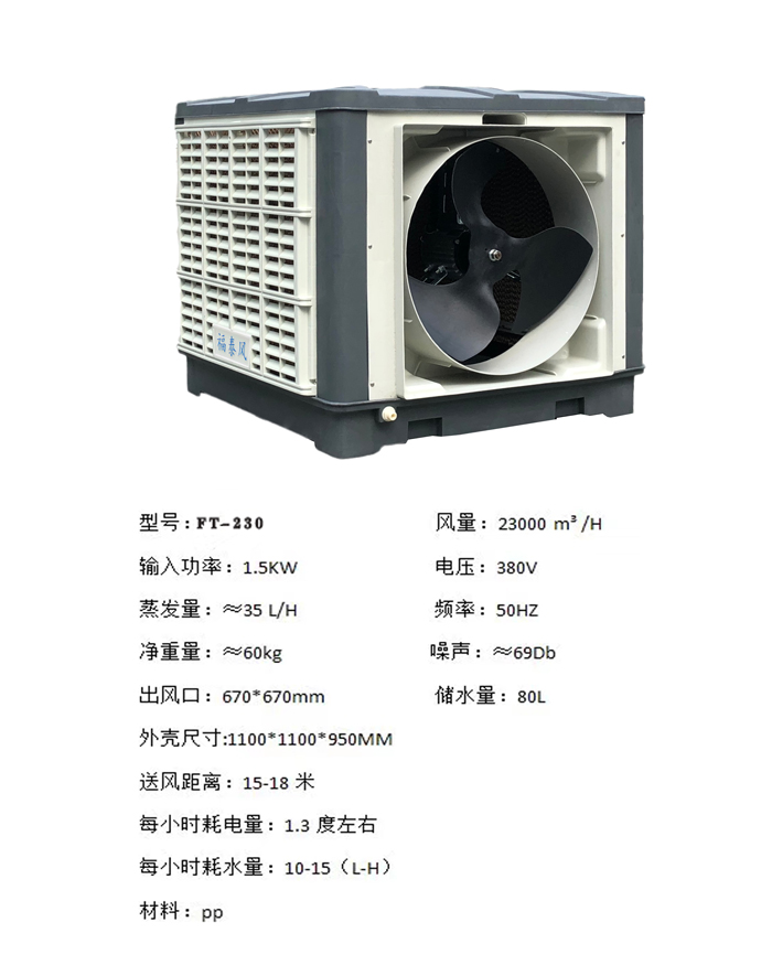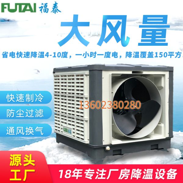 福泰環(huán)保空調(diào)有哪些特點(diǎn)呢? 投資少、效能大:在同等條件及面積安裝中央空調(diào)與蒸發(fā)式冷風(fēng)機(jī)相比,蒸發(fā)式冷風(fēng)機(jī)約是中央空調(diào)總投資的1/5。 耗電少、每小時(shí)用電約1度:在同等面積安裝中央空調(diào)與蒸發(fā)式冷風(fēng)機(jī),耗電量約只需中央空調(diào)的1/8。 空氣質(zhì)量好:集通風(fēng)、換氣、除塵、降溫于一體,增加空間含氧量,提高工作效率,整體送風(fēng)或崗位送風(fēng)隨意選擇。 降溫效果強(qiáng):在南方地區(qū),一般降溫達(dá)4℃~10℃的效果,在炎熱干燥地區(qū),降溫達(dá)到4℃~15℃,并且降溫迅速。 風(fēng)量大、送風(fēng)遠(yuǎn):每小時(shí)最大風(fēng)量為20000至80000立方米,可根據(jù)客戶要求選取,風(fēng)壓大、送風(fēng)遠(yuǎn)。 性能穩(wěn)定、質(zhì)量可靠:采用100mm厚”5090蒸發(fā)濾網(wǎng)“蒸發(fā)效率高,降溫能力強(qiáng)。 調(diào)節(jié)濕度:對(duì)需要增加空氣濕度的工作場(chǎng)所進(jìn)行濕度調(diào)節(jié)。 節(jié)能環(huán)保:綠色低碳,無(wú)污染,節(jié)能環(huán)保,使用壽命長(zhǎng)! 福泰有很多不同功率的機(jī)型供客戶選擇: