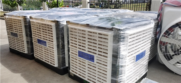 冷風機又叫環保空調、水空調是很多工廠都知道的降溫通風設備,在整個系統的相互配合下,抽風風機迅速排走室內人員、機器產生的熱氣、廢氣、異味,避免了廢氣及異味對人體的刺激。整個室內空氣最快可以在一分鐘內更新一次,這是一般空調所無法達到的效果。