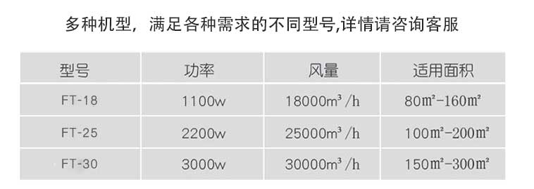 1、每小時耗電1.1度,100~150m2環境通風換氣降溫; 福泰有很多不同功率的機型供客戶選擇: